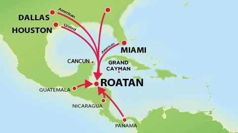 Vuelos disponibles a través de CM Airlines (+504 2243-7590) El servicio de ferry desde La Ceiba el Galaxy Wave Ferry (+504 2445-1775) Los servicios de autobús con Hedman Alas (+504 2516-2273)